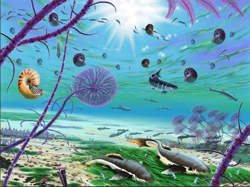 Продолжаю выкладывать палеоарт по девонскому периоду. Сегодня нетематическая подборка – про некоторых беспозвоночных и рыб. Картина М. Шеханова: Усть-ярегское время позднего девона, окрестности Ухты. На дне жили разнообразные плеченогие-брахиоподы (Atrypida, Spiriferida, Productidae, Ladogia), кораллы (Conulata, Rugosa), тут же покачивались морские лилии-криноидеи; из головоногих моллюсков тут Timanites; у дна – панцирные рыбы Holonema, питавшиеся водорослями, а в толще воды – палеониски и майтомасии: Jaekelopterus – наиболее крупный ракоскорпион из раннего девона Германии. Достигал 2,5 м в длину (рис. А. Атучина): Противоположность ему – 10-сантиметровый Nanahughmilleria: До раннего девона дотянули древние аномалокариды. Реликтовый представитель этой кембрийской группы – Schinderhannes bartelsi: В девоне ещё сравнительно разнообразны были трилобиты. Scotoharpes и Walliserops от Franz Anthony: В мезозое самыми успешными головоногими (высшими) моллюсками были аммониты. Древнейший их пре