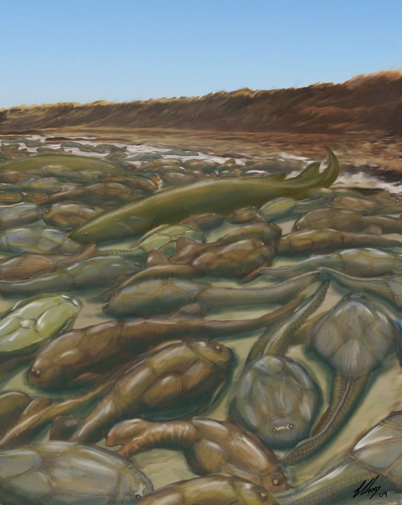 Последний ярус девонского периода носит название фаменского. В его начале случился первый пик великого девонского вымирания, когда почти исчезли бесчелюстные (остракодермы), а в конце – второй пик, выкосивший 19 % семейств и 50 % родов животных. Сильно досталось также трилобитам, плеченогим, конодонтам, кораллам-ругозам. Из причин называются падение астероида, эволюция наземных растений (распространение лесов с относительно развитой корневой системой изменило оборот минеральных веществ в природе, меньше их стало поступать в океан и т.д.), климатические изменения (похолодание) и прочее. Ну и несколько палеоартов, завершающих девонский период. Жертвы пересыхания водоёма (Австралия): Предамфибия Ventastegacuronica, небольшие рыбы (видимо, акантоды) и плакодерма Bothriolepis (слева): Ventastega curonica и Bothriolepis: Выброшенный на берег дунклеостей с пояснением от автора М. Шеханова: А этот дунклеостей ещё плавает: Австралийский «четвероногообразный» (типа кистепёрая рыба) Gooloogongia: