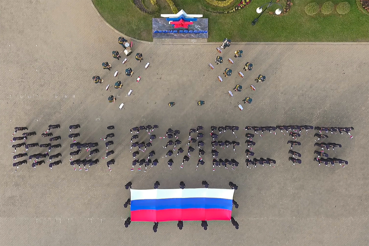 Под аккомпанемент оркестра старший сержант Юрий Глухинький исполнил песню «Ты нужен России!», а более 120 кадетов вынесли восьмиметровый флаг Российской Федерации и выстроились на плацу училища в надпись «Мы вместе».