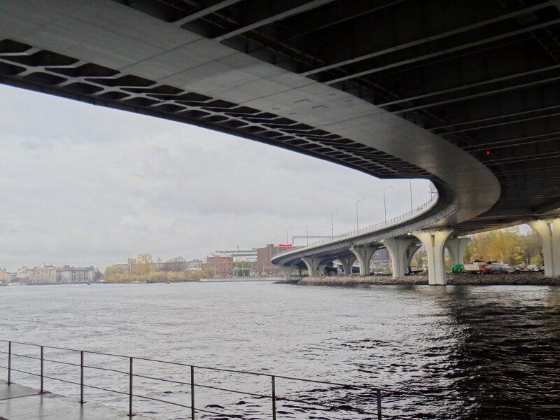 Мост Бетанкура – это не просто переправа, в ближайшие пару лет это будет эдакий «Де Лориан» из Петербурга. Сам по себе – венец инженерной мысли в эпоху «барбер-вейп-крафтовой» деградации. Вписан в окружающий ландшафт практически с точностью до миллиметра, абсолютно нелинейный и главное абсолютно легально и безопасно даёт доступ к панорамам центра и севера (здесь следует поспешить, скоро просто будет вид между кварталами «скандинавских» параллелепипедов) вызывающих душевный трепет. Что важно – перебегать восьмиполосную магистраль нет нужды – на правом берегу две пары лестниц с обеих сторон. И как положено по клише (депрессивный Петербург) начало печальное – якобы дружественные к животному миру «антиптичьи» экраны погубили синичку. Кстати, эти же экраны очень сильно задерживают автомобильные выхлопы – закрытый участок лучше пробегать (и дышать через раз). Слияние времён начинается сразу как поднялся на мост – дом 100+, ангар наводящий на мысли о малиновых пиджаках и цепочках, похожих