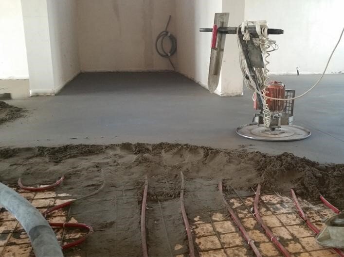 Для изготовления смеси для полусухой стяжки пола требуется специальная смесительная машина — ее использование позволяет добиться идеальной консистенции смеси. Раствор подается при помощи пневмонагнетателя, и современное оборудование для полусухой стяжки пола позволяет подавать его на очень большую высоту, вплоть до 30 этажа. Таким образом, раствор готовится вне помещения. Это дает возможность не только избежать лишней грязи на объекте, но и сэкономить на подъеме материалов на этаж, что особенно важно, если в здании нет грузового лифта. Использование пневмонагнетателя существенно ускоряет и упрощает обустройство полусухой стяжки. Для выравнивания раствора потребуется также шлифовальная машина («вертолет»), благодаря которой можно быстро создать совершенно ровную поверхность.