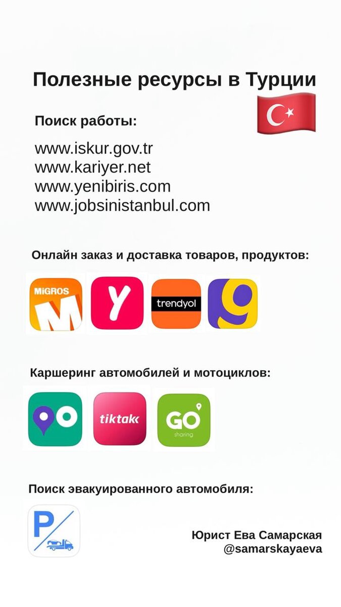 Полезные ресурсы в Турции: поиск работы, онлайн заказ товаров и еды, каршеринг, поиск авто на штрафстоянке, советы по банковским счетам 👩💻Сайты для поиска работы: ✔️www.iskur.gov.tr - портал официальной службы занятости Турции. Вакансии из государственного сектора, крупных компаний и частных фирм. Важно зарегистрироваться, чтобы иметь полный доступ к функционалу, есть вариант на английском языке. ✔️www.kariyer.net – крупнейшая турецкая платформа занятости. Вакансии по всей стране. Удобный поиск по должности, отрасли, специализации и территории. ✔️www.yenibiris.com – ориентирован на педагогов, особенно учителей английского, работников торговли и ресторанного бизнеса, технических сотрудников. Новостной раздел, советы для соискателей и бизнес-справочник, консультации с hr-рами. ✔️www.jobsinistanbul.com – вакансии в Стамбуле для высококвалифицированных специалистов со знанием английского. Есть варианты удаленной работы и с релокацией. 🍔Сервисы онлайн заказа товаров, продуктов: