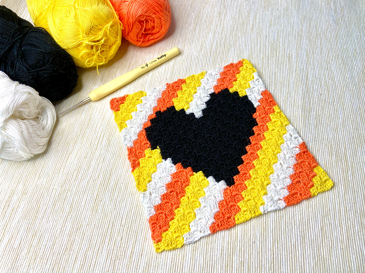 Есть в моей коллекции схема подставки с полосатым сердцем на черном фоне к Хеллоуину. И для полноты коллекции решила сделать схему с обратным рисунком, то есть с черным сердцем на полосатом фоне. В этом мастер-классе поделюсь схемой подставки с черным сердцем на полосатом фоне. О технике вязания крючком С2С. Эта техника вязания мне нравится своей простотой. С ее помощью можно можно создавать полотна с картинками, которые визуально напоминают пиксельные картинки. Ближе с этой техникой можно познакомиться, посмотреть эти 3 видео. О самой технике вязания крючком С2С. О том, как менять цвет по ходу вязания крючком в технике С2С. О том, как прятать кончики нитей на изнаночной стороне. Для того, чтобы попробовать связать первый образец в этой технике можно использовать эту схему. Звездочкой "start" обозначено начало. Материалы и инструменты для вязания подставки под чашку: Для вязания подставки под чашку понадобится подготовить тонкую пряжу и подходящий под эту пряжу тонкий крючок. Схема
