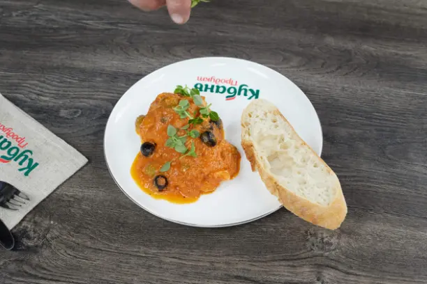 Орегано 1 ч. ложка Приготовление 1. Томаты очистить от шкурки и перебить погружным блендером вместе с чесноком и луком. 2. Обжарить треску с двух сторон на растительном масле, затем влить томатный соус. 3. Добавить к рыбе оливки и маслины. 4. Посыпать орегано и базиликом. 5. Накрыть крышкой сковородку и тушить 5 минут. Сервировка 6. Подать рыбу на порционной тарелке. Приятного аппетита!