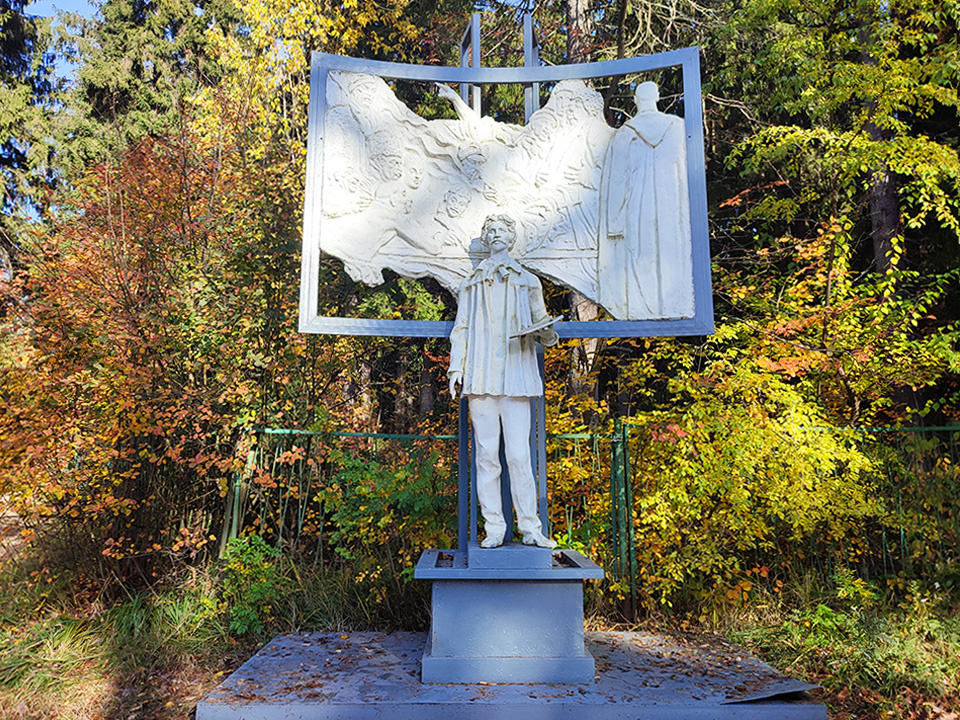 На подходе к музею Пенаты, около парковки стоит красивый памятник И.Е. Репину. Художник изображен на фоне своей картины «Запорожцы», которую он писал одиннадцать лет.