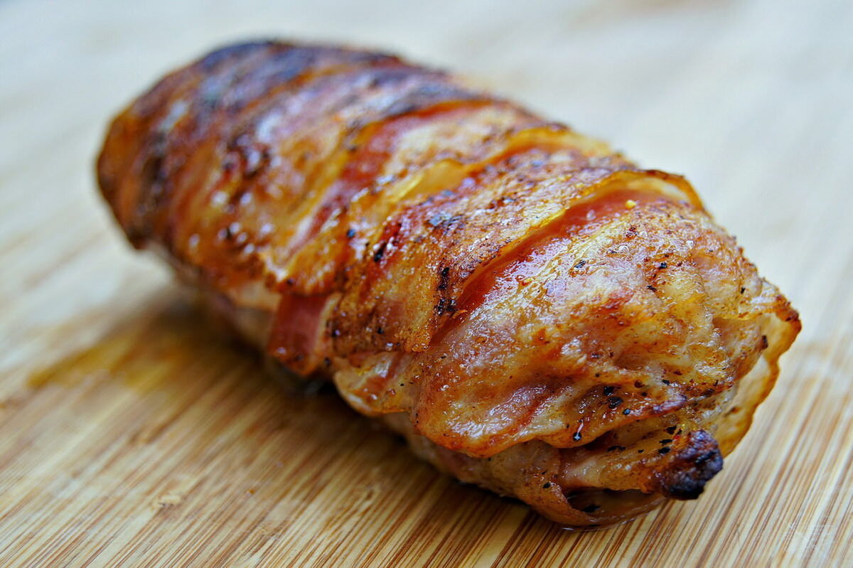 А этот рецепт, скажу честно, не кривя душой, я подсмотрел у Гордона Рамзи. Приготовил, попробовал, угостил друзей, всем понравилось. Поэтому делюсь рецептом с Вами, если конечно вы его не видели у Гордона. Ингредиенты: - куриные окорочка – 3 шт.; - свиной фарш – 300 гр.; - бекон – 200 гр.; - тимьян по вкусу; - фисташки по вкусу; - соль по вкусу; - перец по вкусу; - оливковое масло. Рецепт: Сразу хочу предупредить, рецепт не из самых простых, повозиться вам придётся, а именно с курицей. И так, берём окорочка (бедро и голень в сборе),острый нож и с внутренней стороны аккуратно полностью удаляем кости. Процесс муторный и как закончите со всеми окорочками, уверен, что выдохните с облегчением. Главное не повредите само мясо, дабы потом в этот кусок можно было завернуть начинку. Приступаем как раз к ней. Берём глубокую миску, кладём туда фарш, фисташки (не забудьте их почистить), мелко порезанный тимьян, соль и перец. Тщательно перемешиваем, делим на три равные части и делаем из них три ко