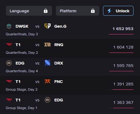 4-й день плей-офф ЧМ по LoL в пике собрал более 1,5 млн зрителей. Пиковый онлайн TI11 по Dota 2 на данный момент составляет чуть более 1 млн
