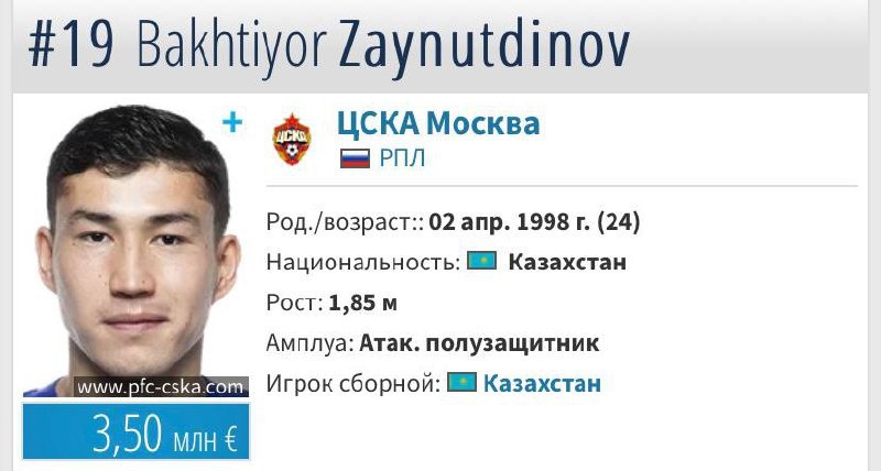 ЦСКА ХОЧЕТ ПРОДАТЬ ЗАЙНУТДИНОВА В ИТАЛИЮ ЗА 5-6 МЛН ЕВРО Как сообщает известный инсайдер Карп: приоритетным вариантом для красно-синих будет продать 24-летнего универсала Зайнутдинова предстоящей зимой в Серию А. Ранее о том, что у агента игрока и клуба есть договоренность, что Бахтиера отпустят, в случае получения достойного предложения в ближайшее трансферное окно — сообщал Джума. У клуба Орешкина хорошие подвязки в футбольной Италии + внятная система получения денег за трансферы. ЦСКА рассчитывает получить за Зайнутдинова — не менее 5-6 млн евро.