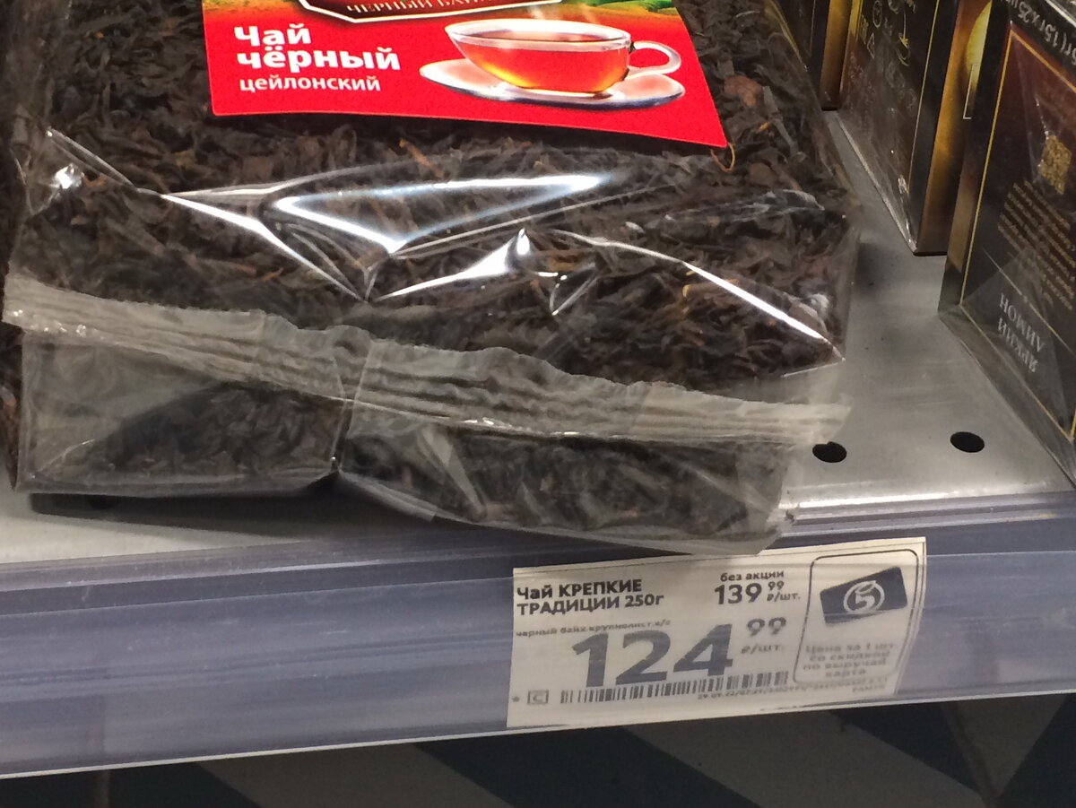 Если кто не знает, в магазинах Вам обязаны пробить товар по той цене. которая обозначена на ценнике. Мы пробили оставшийся товар. расплатились и направились к выходу. Не подумали как-то, что в чеке могут быть ещё ошибки, как-то многовато было бы для одной небольшой покупки, на сумму меньше тысячи рублей. Но перед самым выходом решили проверить оставшиеся позиции в чеке. Сразу бросилась в глаза завышенная цена на чай. Вместо написанных на ценнике 124-99 в чеке стояло 139-99. Я вернулась к чайной полке и сфотографировала ценник на телефон,
