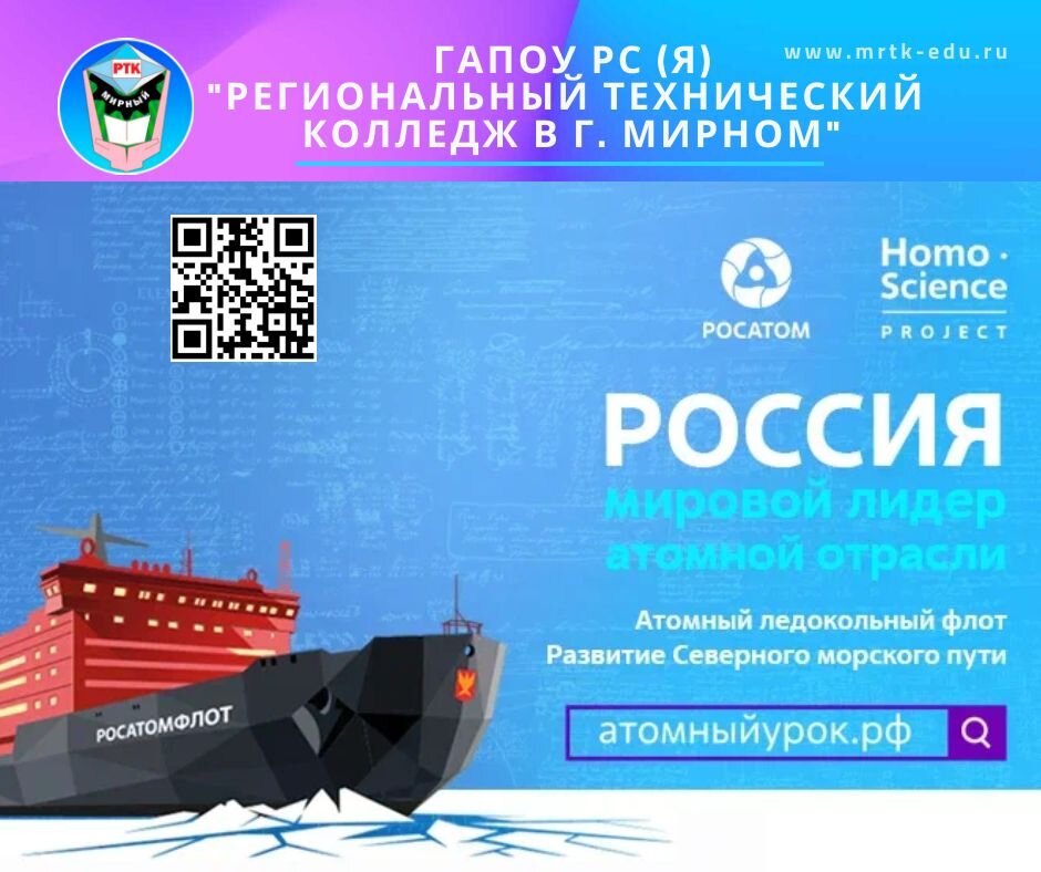 «Разговоры о важном» в МРТК: «Россия - мировой лидер атомной отрасли». Социальные сети МРТК: подпишись и живи ярко! Очередное занятие цикла «Разговоры о важном» 24 октября 2022 г. посвятили теме «Россия – мировой лидер атомной отрасли» Студенты узнали об исследователях Арктики и Северном морском пути. Им рассказали, что сообщение по Северному морскому пути все время развивается — строятся и совершенствуются порты, города и поселения, обеспечивающие движение. Самые крупные из них — Сабетта, Дудинка, Хатанга, Диксон, Тикси, Певек. Мурманск и Архангельск также являются важными портами. Со временем эти поселения стали иметь не только региональное, но и всероссийское, и даже мировое значение, ведь использование Северного морского пути позволяет сокращать время транспортировки грузов для многих стран мира, и таким образом экономить на стоимости перевозки при большем объеме доставляемых грузов. Обучающиеся познакомились с историей появления ледоколов, получили информацию об особенностях атомн