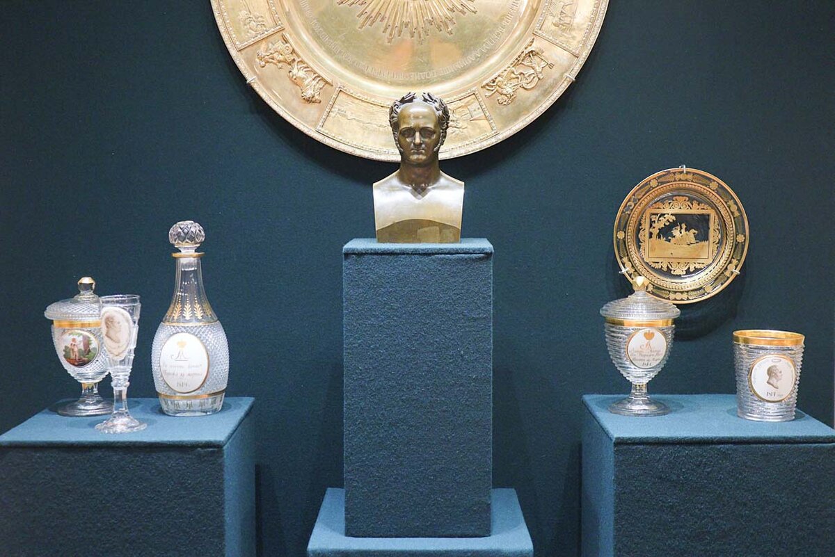 Разумеется, в экспозицию вошли не только художественные произведения. В витринах представлены вещи, принадлежавшие Александру I. Например, костюм будущего императора, в котором Александр появлялся на дворцовых приемах в возрасте 7–8 лет: камзол, жилет и штанишки из парчи, шитой золоченой нитью. Также здесь можно увидеть генеральский мундир императора, сшитый в 1814 году в Париже. Вполне возможно, именно в нем Александр присутствовал на пасхальном богослужении на парижской площади Согласия. Рядом – его шляпа, шпага и два казачьих пистолета, сделанных в Туле специально для императора.