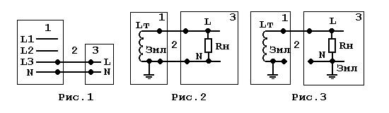 От трансформатора идёт 2 провода, один – так называемый фазовый провод с напряжением, а другой – нулевой провод, от которого отведено заземление, осуществляемое помещением контакта в землю. Существуют и другие источники заземления помимо собственно земли, на данных рисунках заземление обозначено буквами $Змл$.