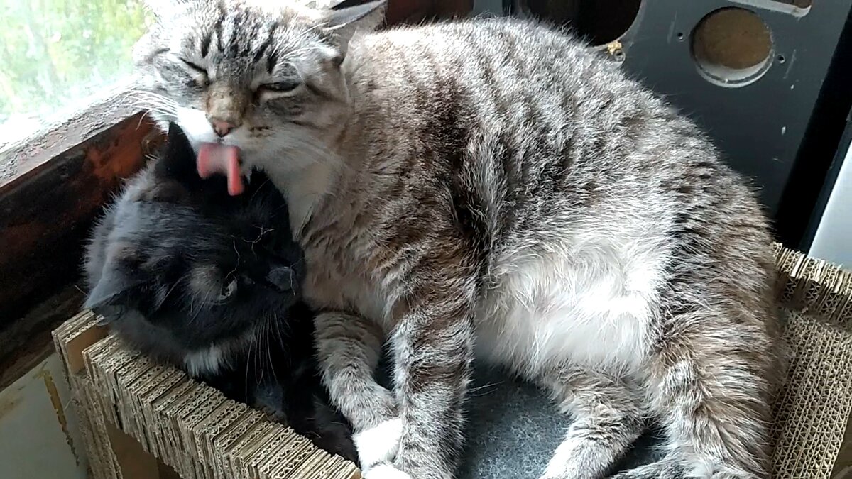 Кот Беляшик не всегда хилиган, задира или отважный лентяй. Иногда он - заботливый и хороший друг. Поймал его на лоджии за процессом ухода за кошкой Чернухой. Теперь буду представлять его к мясной котлете "За вылизывание чёрных кошек" 1 степени.