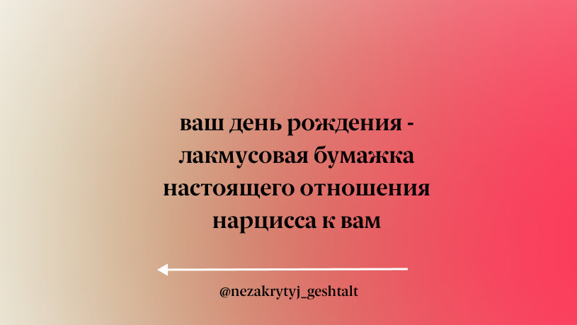 Праздники и отпуска с нарциссами становятся отдельным видом пыток. Не знаю, что первостепенно - желание нарцисса вас ранить как можно сильнее и закручивание его издевательств именно в этот период, или что в периоды, когда в здоровых отношениях люди особенно трепетно и внимательно относятся друг к другу, просто деструктивный сценарий и дурное отношение легче подметить. Как ни странно, именно ваш день рождения будет лакмусовой бумажкой отношения нарцисса к вам. Потому что по традициями это действительно ваш день, вы имеете право чувствовать праздник и его особенность, это сакральный день каждого человека, это обновление его личного цикла в жизни, переход в новый возраст и на новый уровень развития. Это ценно. Это огромный праздник, что человек в свой день рождения достиг новой даты и усердно справлялся со всеми трудностями в предыдущий год. Это время восхваления и поздравлений, благословений человека, в конце концов. Но разве нарцисс отдаст вам так просто "венец" особенного человека хот