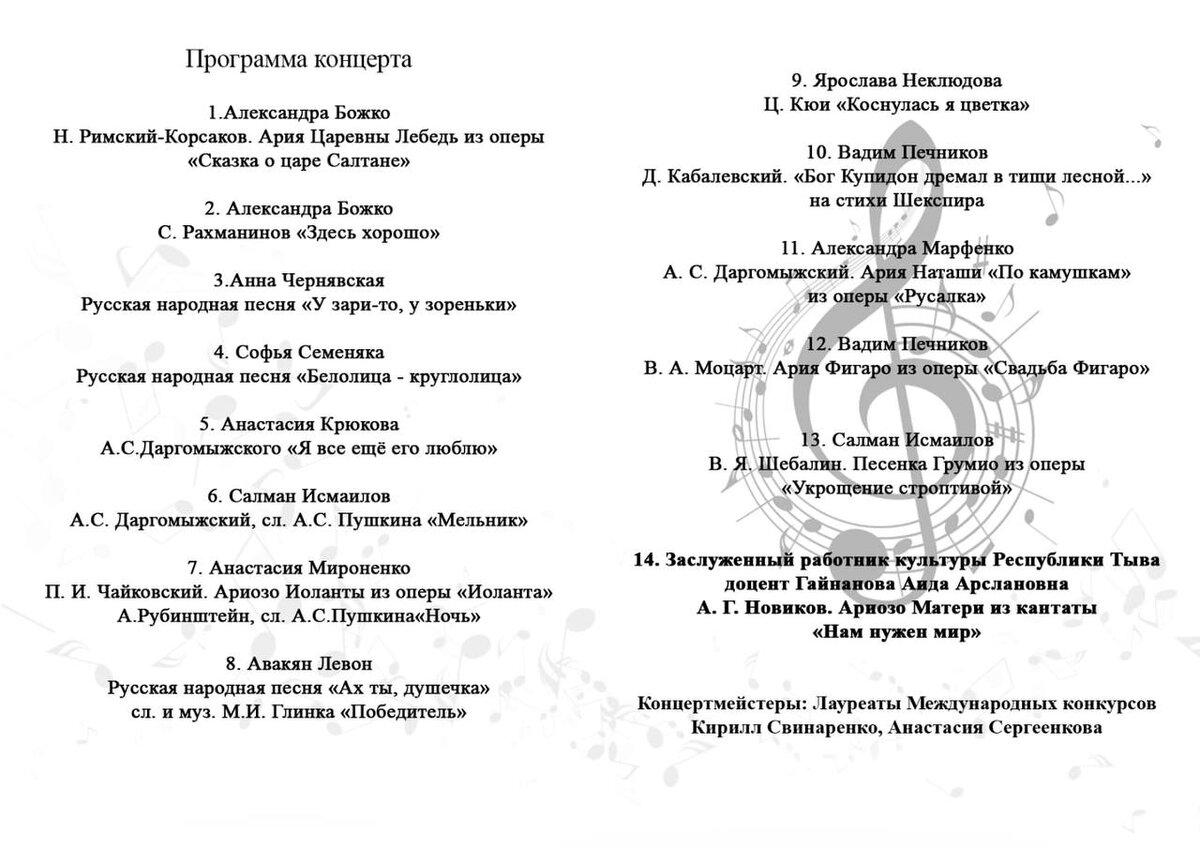 🎵 21 октября в #ДипломатическаяКадетскаяШкола состоялся Благотворительный концерт «Время музыки», посвященный большому празднику всех любителей и ценителей музыки - Международному дню музыки. 🎶 Концерт стал дополнением к прошедшему в начале учебной недели уроку «Разговоры о важном», темой которого стала музыка. 🌟 Преподаватели и лучшие кадеты школы смогли насладиться чарующими звуками музыки Чайковского, Моцарта, Римского-Корсакова из опер "Иоланта", "Свадьба Фигаро", "Сказка о царе Салтане", а также услышать русские народные песни: "Ах, ты, душечка", "Белолица-круглолица", "У зари-то зореньки", а также другие произведения классической и народной музыки. 🎤 Незабываемый музыкальный подарок коллективу школы преподнесли преподаватели и студенты Российской академии музыки имени Гнесиных и Российской Академии искусств (РГСАИ) под руководством заслуженного работника культуры, доцента Гайнановой Аиды Арслановны. Концертмейстеры: лауреаты международных конкурсов Анастасия Сергеенкова