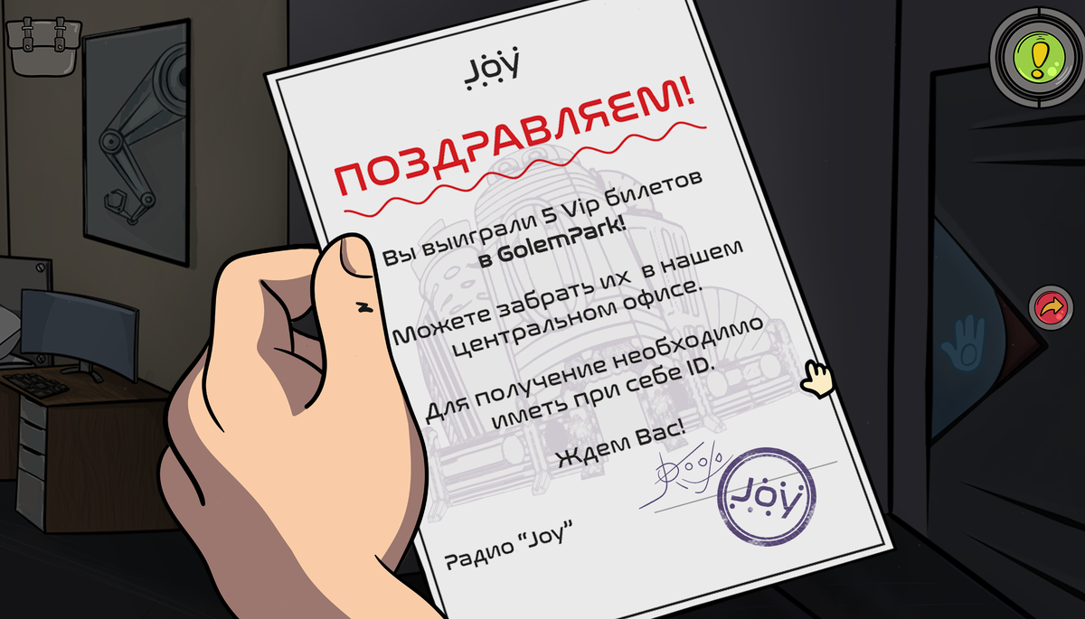 Герою приходит приглашение на пятерых в GolemPark, но чтобы отправиться туда, сперва нужно найти свою ID-карточку.