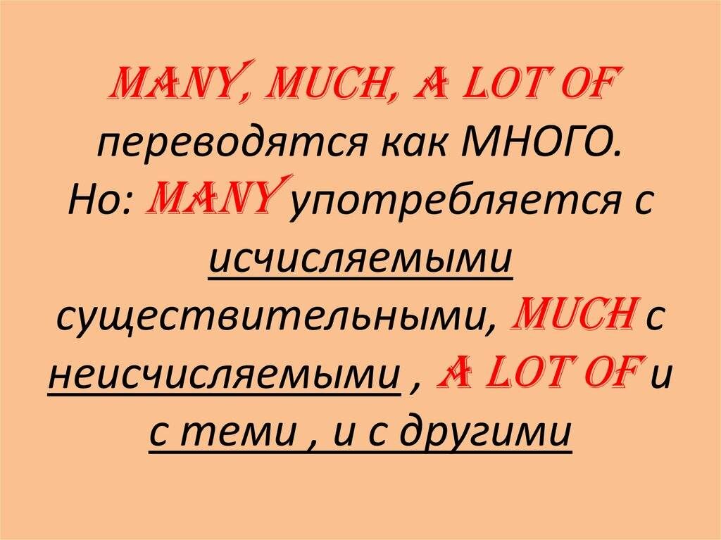 “Many”, “much” и “a lot”- переводятся на русский язык как слово "много". В чем же разница между ними и как их употреблять? “many” Первое главное правило - разница между “much”, “many” в том, что в английском языке “many” мы употребляем только с исчисляемыми существительными (то есть с теми, которые мы можем посчитать). Исчисляемые существительные могут употребляться как в единственном, так и в множественном числе: “much” “Much” используй только с неисчисляемыми существительными в единственном числе (их невозможно посчитать). Обычно к ним относятся: Например : много чая - much tea, много снега- much snow, много серебра- much silver. Следующее правило - “a lot of” можно употреблять в обоих случаях: и с исчисляемыми существительными и с неисчисляемыми. Здесь важно запомнить, что “a lot of” используют в утвердительных предложениях. Также при неформальном общении можно использовать сокращенную форму “lots of”. Например,: “He’s gave a lot of flowers for her” или “ He’s gave lots of fl