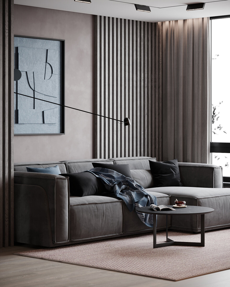 В зоне гостиной акцент сделали на дизайнерском кресле, идеальном по посадке MIAMI LUX. Остальные элементы интерьера в нейтральных оттенках: 3-местный диван RIO с ярким дизайном и обивкой в тактильно приятном велюре, и журнальные столики LOFT cо столешницей в фактуре венге и металлическим основанием, окрашенным в элегантный черный.