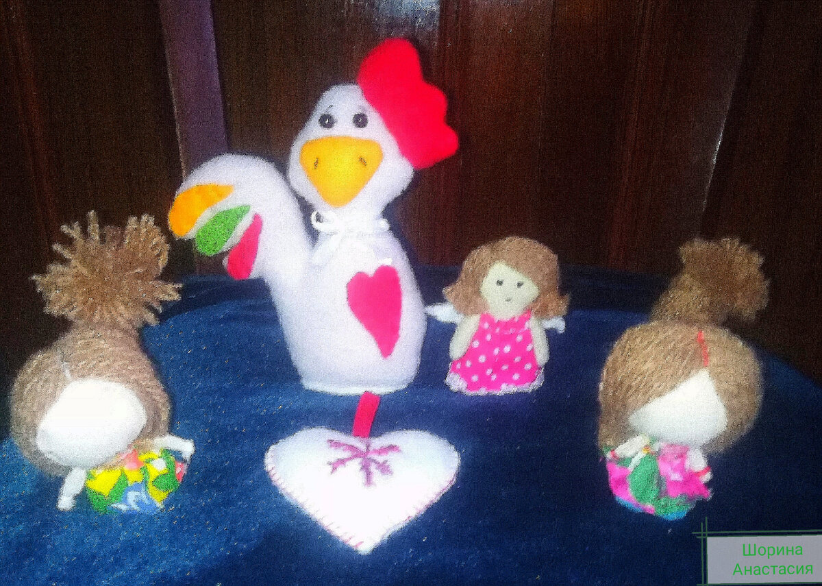 Как я уже писала первую игрушку, самую примитивную из двух деталей, я сшила лет семь назад. Потом выбирала игрушки и куклы посложнее, более проработанные. Чтобы они умели стоять или у них была сьемная одежда. В этой статье решила показать вам, дорогие друзья- подписчики, сшитые игрушки и куклы из ткани. Многие игрушки я продала так и не успев сфотографировать или потеряла доступ к фотографиям после удаления Яндекс.Фотки и форматирования ноутбука. На первом фото примитивный петушок, рост 15-20 см, сердечко-елочная игрушка, брелок девочка 3-5 см и две куколки с косами- Доля или Счастье (женское счастье). Следующие игрушки- это небольшие брелоки для ключей в виде куколок и совы из фетра. Они были сшиты на заказ и отправились в Кострому и Иваново. Брелок с буквой V- это подарок с инициалом имени. Третья игрушка- снеговичок, сшила его перед новым годом. Его хотела купить одна девушка, но позже отказалась. Под предлогом, что не хватает денег, хотя я недорого продавала. Ждёт добрые ручки. Э