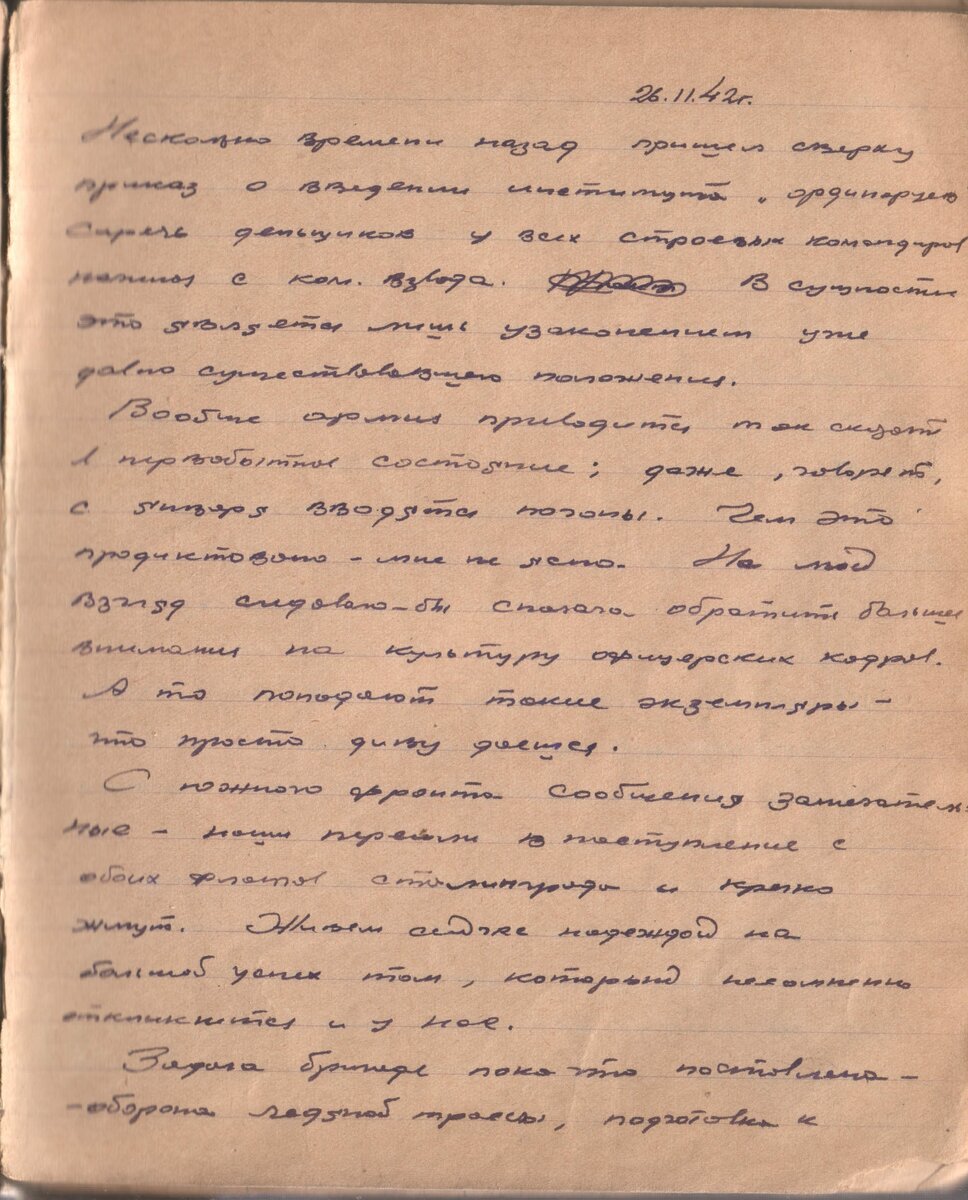 26.11.42г. Несколько времени назад пришел приказ о введении института «ординарцев», сиречь деньщиков у всех строевых командиров начиная с ком. взвода. В сущности это является лишь узакониванием уже давно существующего положения. Вообще армия приводится так сказать в первобытное состояние: даже, говорят, с января вводятся погоны. Чем это продиктовано – мне не ясно. На мой взгляд следовало-бы сначала обратить больше внимания на культуру офицерских кадров. А то попадают такие экземпляры – что просто диву даешся. С южного фронта сообщения замечательные – наши перешли в гаступление с обоих фронтов сталинграда и крепко жмут. Живем сейчас надеждой на большой успех там, который немножко откликнется и у нас. Задача бригаде пока что поставлена – оборона ледяной трассы, подготовка к организации которой ведется очень деятельно. Часть бригады готовятся к выходу на лед. Заготовлены уже бревенчатые ДОТы предназначенные к установке на льду и засыпке снегом с последующим обледенением его. 1-й батальон