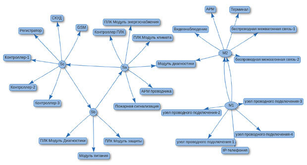 Рассмотрим особенности сети подвижного состава на примере пассажирского поезда. Эта сеть сложней и больше, чем на большинстве видов транспорта, отличается количеством устройств (их около 20 в каждом вагоне) и регулярными изменениями масштаба сети, связанными с формированием поезда, в том числе по пути следования. Последнее неразрывно связано с проблемой надежности межвагонных проводных соединений, которая решается путем резервирования связей, в том числе беспроводными межвагонными подключениями. Общая длина состава может превышать 25 вагонов. На рис. 1 показана упрощенная типовая схема сети одного пассажирского вагона.
