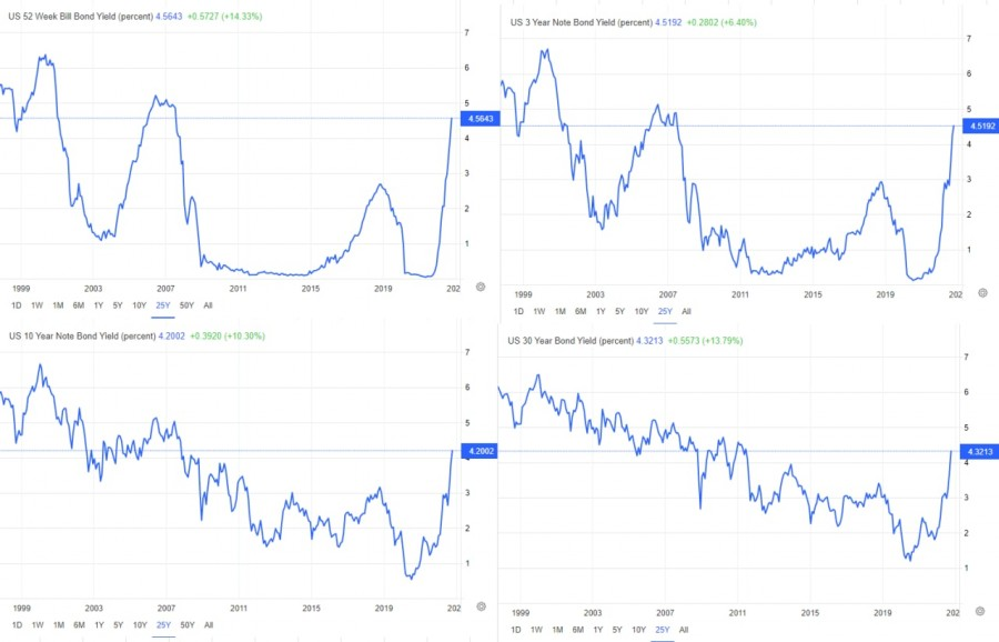 Впервые за 20 лет ставки по трежерис стали выше, чем полная доходность S&P500. Экстремальный рост ставок на денежных и долговых рынках в долларовой зоне приведет к неизбежному смещению в приоритетах долгосрочных и консервативных инвесторов, как пенсионные, страховые и ETF фонды, ориентированные на получение стабильных денежных потоков, а не к захвату курсовой разницы котировок, чем заняты хэдж фонды и агрессивные спекулянты.