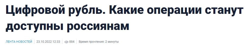 Помните, весь 2021 год постоянно поступали новости о том, что в России вот-вот введут цифровой рубль? Проект по запуску цифрового рубля активно пиарился во всех СМИ, и в Банке России на всех пресс-конференциях, во всех обзорах обязательно уделяли место этому вопросу. Говорилось о том, что пилотные проекты цифрового рубля будут запущены уже в 2022 году. И вот, 2022 год подходит к концу. В начале февраля действительно была новость о том, что стартовал некий эксперимент по запуску цифрового рубля, в котором должны были принять участие 12 банков. Ну а потом... наверное, как-то уже не до цифровой валюты стало и в стране в целом, и в ЦБ в частности. С марта по октябрь о цифровом рубле ничего не было слышно (я читаю аналитические обзоры ЦБ, и эта тема из них почему-то исчезла). Однако, вот сейчас СМИ решили напомнить россиянам словосочетание "цифровой рубль". В ряде изданий вышли публикации о том, что проект все же планируют запустить, теперь уже - с апреля 2023 года. Снова в тестовом режиме.