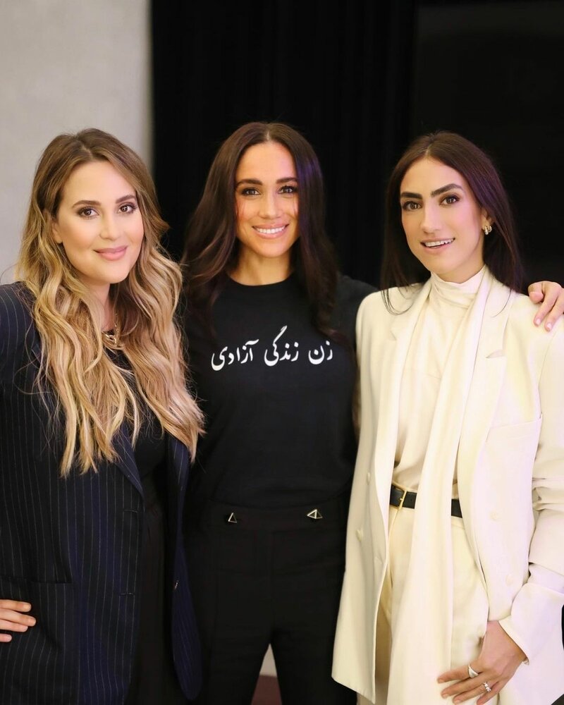 Герцогиня выразилась в поддержку женщин Ирана, которые борются за свои права. Еще больше новостей в нашем Telegram-канале, группе ВКонтакте и канале Яндекс.Дзен ______________________________ 41-летняя Меган Маркл посетила специальное мероприятие в штаб-квартире Spotify в Лос-Анджелесе. Дискуссия была посвящена свободам женщин Ирана, которые после убийства местной 22-летней активистки протестуют против ношения хиджаба. С собой герцогиня привела сотрудниц фонда Сассекских Archewell иранского происхождения — виде-президента по глобальным коммуникациям Эшли Хансен и президента Мандану Даяни. В поддержку иранских женщин Меган надела простую черную футболку от бренда Etsy с символичным слоганом на персидском языке, в переводе означающим “Женщины, жизнь, свобода”. Футболку-заявление Меган сочетала с черными шерстяными брюками от Valentino с металлическими деталями на поясе. Отметим, что Меган Маркл всегда открыто высказывается в поддержку прав женщин. Кроме того, она считает, что ее супруг,