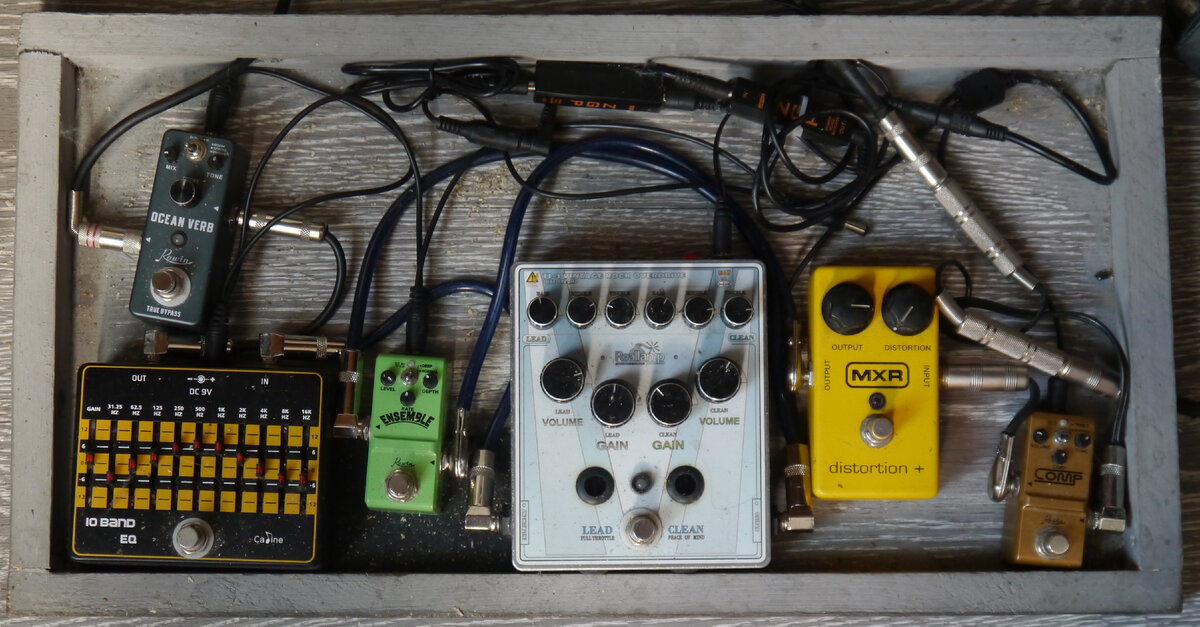 Здравствуйте, дорогие товарищи ! Сегодня я опять решил побаловать вас текстовым материалом с картинками. Темой сегодняшней статейки будет содержимое и структура моего педалборда. Этот педалборд я сделал сам, можете посмотреть из чего и как его делать) Итак начнем с питания: блок питания у меня от какого-то проводного телефона, судя по всему, импульсный и шумный 9В, 3А. Чтобы избежать этого и другого шума у меня стоит два сетевых фильтра для гитарных педалей. Вот один из фильтров: обзор здесь Первым номером в моем педалборде идет разветвитель сигнала, он же самопальный сплиттер и он же замена директ-боксу. Посмотреть про него можно здесь Поэтому сразу из одного кабеля выходит два: один идет на педалборд и в пульт, а из пульта и на вход звуковой карты. А второй идет чистым директ-сигналом в другой канал пульта и на другой вход звуковой карты. Итак, педалборд начинается с компрессора Rowin Comp Nano Pedal Это крутой, дешевый и аналоговый компрессор. Обзор здесь: Следом за ним иде