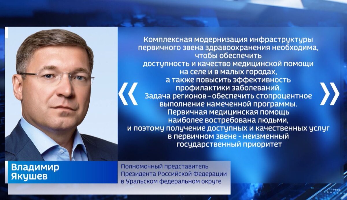 Капитальный ремонт двухсот объектов, покупка почти двух тысяч единиц медицинского оборудования – планы на октябрь программы модернизации первичного звена здравоохранения в малых городах и сельских населенных пунктах регионов Уральского федерального округа. Реализация мероприятий проходит под контролем полномочного представителя президента России в УрФО Владимира Якушева. Комплексная модернизация инфраструктуры первичного звена здравоохранения необходима для того, чтобы обеспечить доступность и качество медицинской помощи на селе и в малых городах, а также повысить эффективность профилактики заболеваний. Задача регионов – обеспечить стопроцентное выполнение намеченной программы, отмечает Владимир Якушев.
