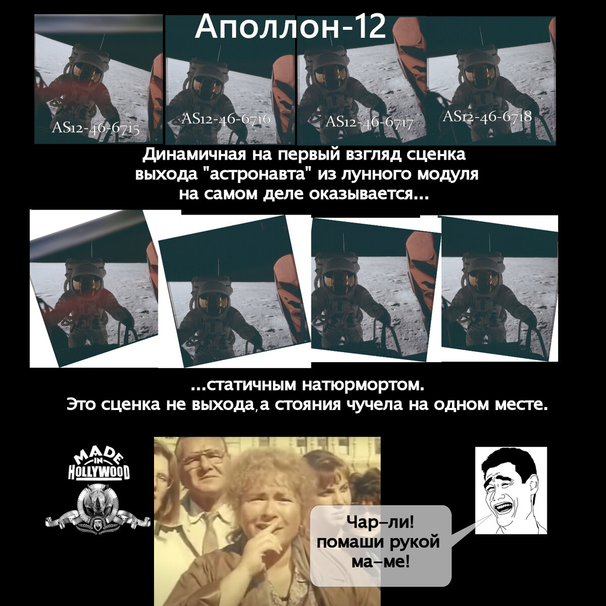 Как видите, разные части левой руки сместились по разному! Одни вверх, другие - вниз. "Статичное чучело", говорите? Понимая бредовость "логики" нелетальщиков, могу предсказать их объяснение: американцы 1969 года слизали робота Федора из 2018 года, обрядили его копию в скафандр и снимали в Голливуде.))) Кстати, нелетальщик, взявший себе ник Евгений Миронов, уверяет, что этих снимков вообще не должно существовать: