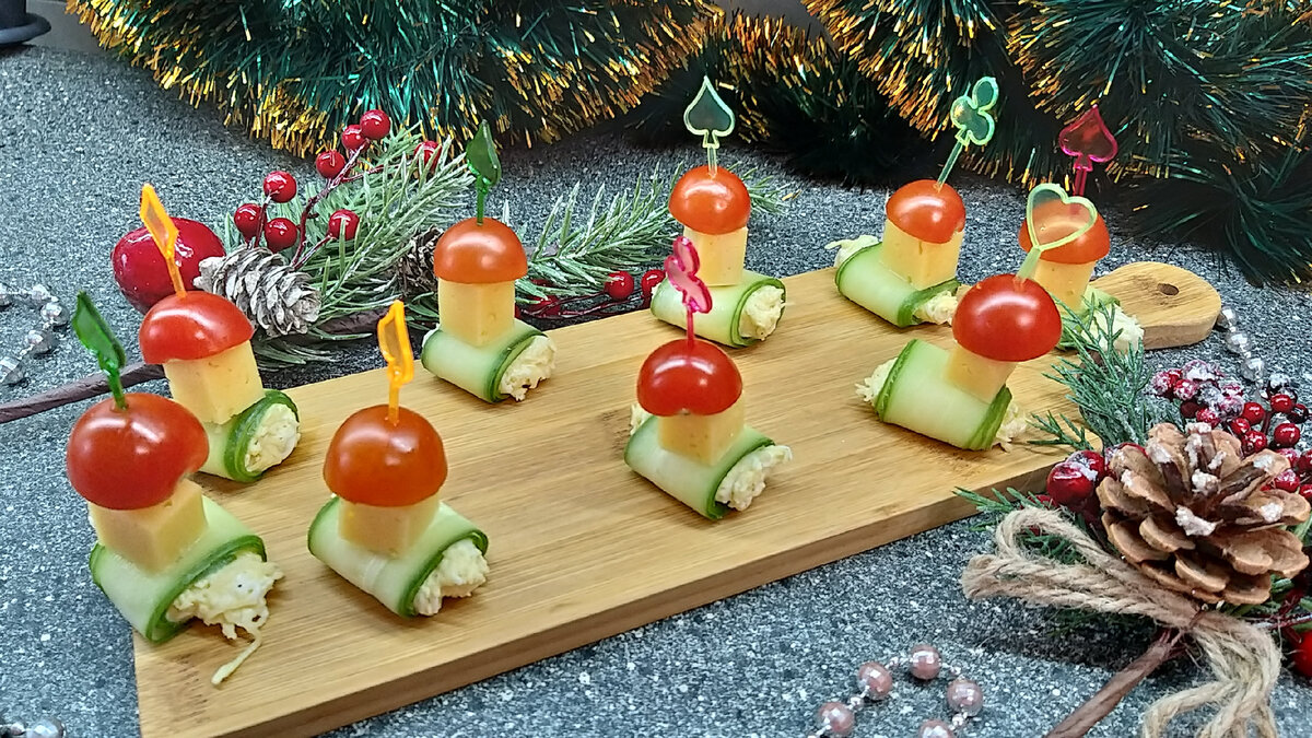 Привет, друзья! Сегодня приготовим очень простую и вкусную закуску, которая прекрасно подойдет на любой праздничный стол. Для приготовления нам понадобится: 📖Ингредиенты: Для приготовления нам понадобится 100 грамм сыра. 50 грамм сыра я натираю на мелкой терке. Вторую часть сыра я заранее нарезала мелким кубиком. Выдавливаем 1 зубчик чеснока к натёртому сыру, добавляем щепотку соли и черного перца. добавляем пару ложек майонеза я использую домашний. Как я готовлю домашний майонез? Видео рецепт приготовления домашнего майонеза смотрите на моем канале. Натираем на мелкой тёрке одно вареное яйцо. Все хорошо перемешиваем, и наша начинка готова. Огурец 1 шт. нарезаем на тонкие полоски. При помощи овощечистки. Семенную часть не используем. Она нам не пригодится. Помидорки черри разрезаем пополам. На полоску огурца выкладываем чайную ложку сырной начинки, сворачиваем рулетом. На шпажку нанизываем половинку помидора черри и кусочек сыра. Получается вот такая вкусная и простая в пригото