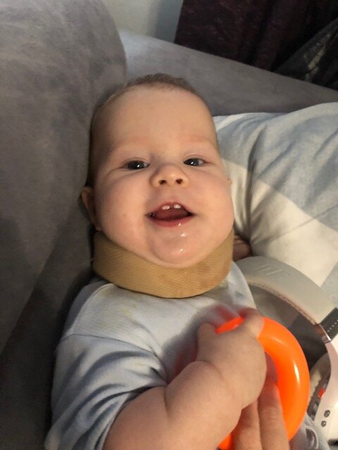 О том, что у малышей случается кривошея я узнала еще будучи беременной и была очень рада, что нас это обошло стороной. Однако, когда малышам было 3 месяца, я заметила, что Варя наклоняет голову только к правому плечику - так называемый "привычный наклон" или "кривошея". В 4 месяца мы прошли курс общего массажа, рекомендованный неврологом. Не помогло. На плановом приеме у невролога в 5 месяцев нам был прописан очередной курс лечебного массажа, тепловоротник, электрофорез и ношение воротника Шанца. Воротник Шанца - это ортопедическое изделие, предназначенное для фиксации шейного отдела позвоночника. Носить его рекомендовали во время поездок в автолюльке и коляске. Важный момент - надевать воротник малышу следует, когда он лежит на животе, иначе воротник просто не застегнется. Нам подошел самый маленький размер. Так как выходили из дома мы нечасто, я надевала его дома. Кривошея у двойняшек - довольно распространенное явление. Зачастую кому-то из малышей попросту не хватает места в жив