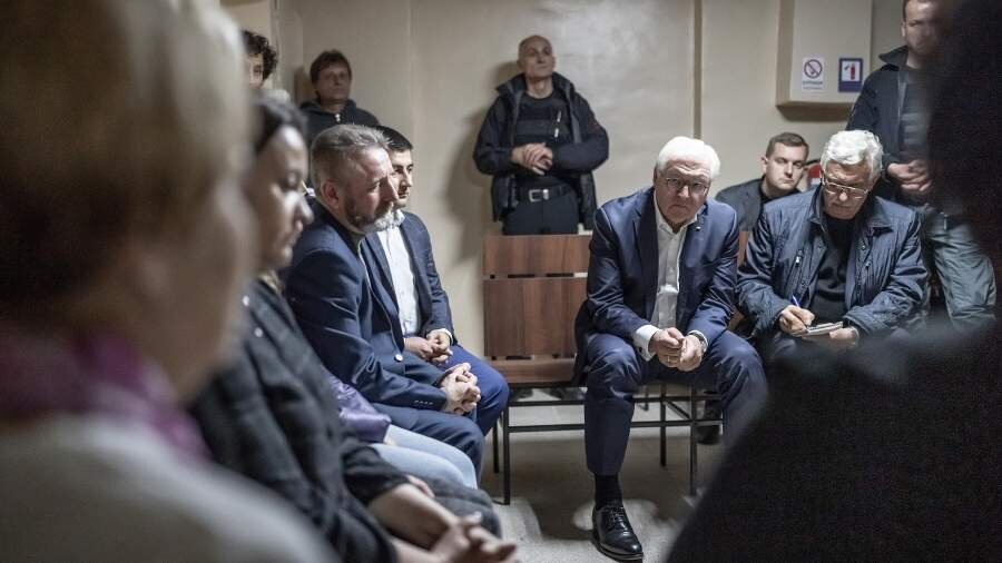 Во время посещения Штайнмайером города Корюковки в Черниговской области была объявлена воздушная тревога. Немецкий лидер, общавшийся в тот момент с местными жителями, продолжил диалог с ними в бомбоубежище.
