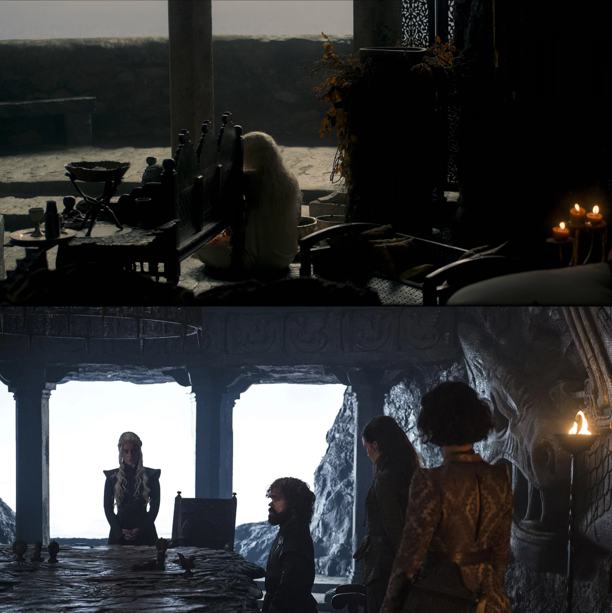 Драконий камень Когда Рейнира проходит через тяжелый момент ее жизни, мы можем немного разглядеть ее покои. Некоторые кадры кажутся зрителям знакомыми, потому что это то место, где Дейнерис в "Игре престолов" размышляла о планах со своими советниками. Правда пришлось перенести огромной стол из зала. Стол Данный экземпляр стол-карту мы уже видели в "Игре престолов". Именно у этого стола стоит Дейнерис на предыдущем кадре. Им также пользовался и Станнис Баратеон. Вот только ни Дейнерис, ни Станнис никогда не использовали его во всю красоту. Если поместить пламя под стол, то все основные дороги и регионы будут подсвечены. Городская стража В одном моменте во время разговорах о будущих планах по возвращении престола Деймон говорит, что они могут заручиться поддержкой части стражи. Предположение это взято не на пустом месте. В самой первой серии Деймон предстает, как командующий стражей. Именно под его началом были образованы золотые плащи, а некоторые верные ему воины отправились вместе с н
