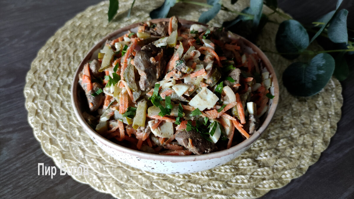 Сегодня готовим вкусный и сытный салат. Здесь не используются сезонные продукты и поэтому приготовить его можно в любое время года. Этот салат хорошо подойдет для семейного ужина и для праздничного стола. *** Подробный рецепт можно увидеть в видео на моем канале здесь или на канале YouTube Пир Богов вот здесь 🥘🧆🥗. Еще там есть много вкусных рецептов. 🥧🍹Подписывайтесь))) 😉 🤗А это мы в VK: https://vk.com/pir.bogov *** Состав: 500гр куриной печени 250гр моркови по-корейски 2 соленых огурца 2 вареных яйца 1 луковица Масло для жарки Майонез/сметана Зелень Соль и черный перец Способ приготовления: Промываем и слегка просушиваем куриную печень. Срезаем пленочки и крупные кусочки разрезаем пополам. На среднем огне разогреваем масло и выкладываем печень. Обжариваем несколько минут, периодически помешивая. Готовая печень станет светлой. Крупный кусочек можно разломать, чтобы посмотреть готовность внутри. Салат не выкладывается слоями и поэтому все подготовленные ингредиенты сразу кладем