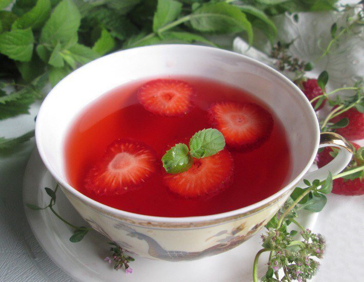 ИНГРЕДИЕНТЫ: Вода — 1 л; Клубника — 200 гр.; Мята — 2 веточки; Лимон — 4 дольки; Тимьян — 5 веточек; Корица — 1 шт.; Мед (жидкий, по вкусу, или по 1 ч. л. на чашку) — по вкусу; Кислота лимонная (только для консервации) — 1 ч. л.. СПОСОБ ПРИГОТОВЛЕНИЯ: Клубнику мою, очищаю, разрезаю на половинки или четвертинки. Лимон нарезаю кружочками, достаточно 4 дольки, или по вкусу. Веточки мяты и тимьяна вымыла, обсушила. Приготовила палочку корицы. В заварочный чайник, или удобную эмалированную посуду, поместила клубнику, дольки лимона, палочку корицы, веточки тимьяна и листочки мяты (10 листочков, или по вкусу). В другой ёмкости закипятила 1л воды и кипятком залила подготовленные продукты. Накрыла крышкой и даю настояться, приблизительно 10 минут. Когда чай приобретёт красноватый оттенок, он готов! Чай наливаю в чашки, предварительно добавив в каждую по 0.5 - 1 ч. л. жидкого мёда, или по вкусу. Приятного чаепития!