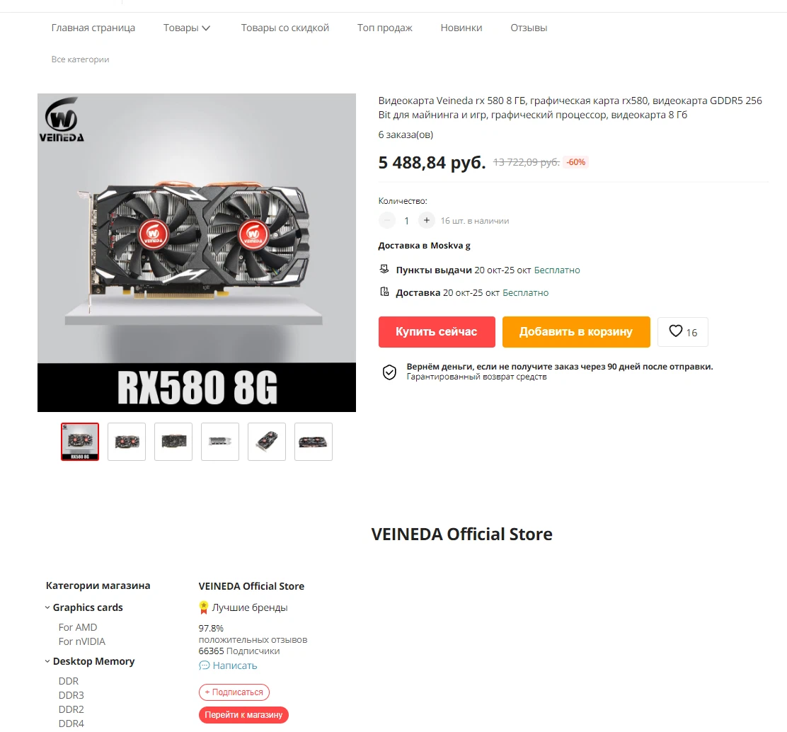 Я приветствую Вас, уважаемые любители компьютеров и компьютерных игр! Сегодня забрал на почте видеокарту, которую заказывал не так давно за 5 с лишним тысяч рублей. Видеокарта от китайского бренда Veineda. Покупал здесь. И вот, спустя почти месяц видеокарта у меня. Как обычно снимаю распаковку на видео (это необходимо, если будете открывать спор, так вы докажете, что не вы повредили устройство). Фирменная коробка от китайского бренда (одинакова для всех его продуктов). Открываем её. Внутри нас встречает традиционный китайский переходник с молекса на 6 пин питание видеокарты. Так же в коробке идет диск?! с драйверами. Подозрительно, зачем же он тут нужен ? )) Кстати вы еще пользуетесь дисками, или уже давно забыли, что это? Сама видеокарта. Мощная система охлаждения с медными теплотрубками, видеокарта тяжелая на вес. Фирменные наклейки китайского бренда присутствуют. Все, как на картинке у продавца. Сзади присутствует табличка, на которой нас заверяют, что здесь "настоящая" RX 580 8 gb