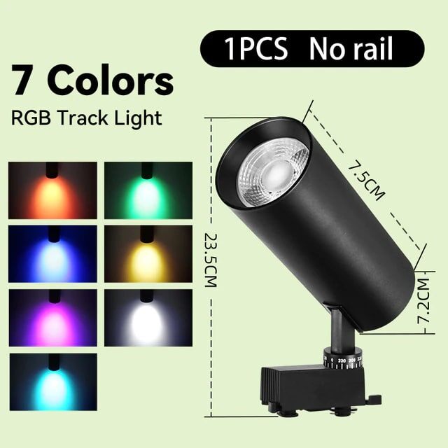 Трековый светодиодный RGB светильник на AliExpress за 452₽. Имеет размер 7.5х23.5х7.2 см, мощность 20 Вт, 7 цветов подсветки, изготовлен из алюминия.