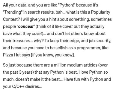 Если вы прочитали статью, — если вы прочитали хотя бы заключительную часть — вы легко поймете, что эта статья не о Python. Это очень очевидно. Тогда почему этот человек оставил такой комментарий? Он/она глупый? Я так не думаю. По тому, что пишет этот человек, мы видим, что он быстро пробежался глазами и пришел к выводу, основанному на том, что он слышал или читал ранее. Тогда зачем оставлять такой комментарий?