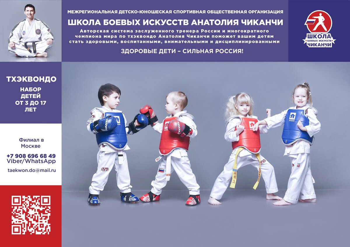 Главная задача нашей школы – оздоровить ребенка. Мы знаем возрастные особенности детей и подростков: физическая нагрузка способствует улучшению осанки, развитию мелкой моторики и профилактике плоскостопия, а специальные дыхательные упражнения направлены на профилактику астмы. Большое внимание мы уделяем развитию речи и памяти. Наши дети меньше обращаются к врачам! Школа боевых искусств 11-кратного чемпиона мира по тхэквондо Анатолия Чиканчи – это одна большая сплоченная и дружная семья, где успех каждого – общий успех. Мы добились отличных результатов в спорте, в подготовке своих тренерских кадров, в воспитании детей и молодежи. В школе работают высококвалифицированные тренеры – опытные специалисты, энтузиасты своего дела, болеющие за результативность своей работы. Спортсмены нашей школы многократно становились чемпионами мира и Европы, отстаивали цвета флага России на соревнованиях в Канаде, Южной Корее, Италии, Испании, Англии, Шотландии, Швейцарии, ЮАР, Аргентине, Болгарии и во мног