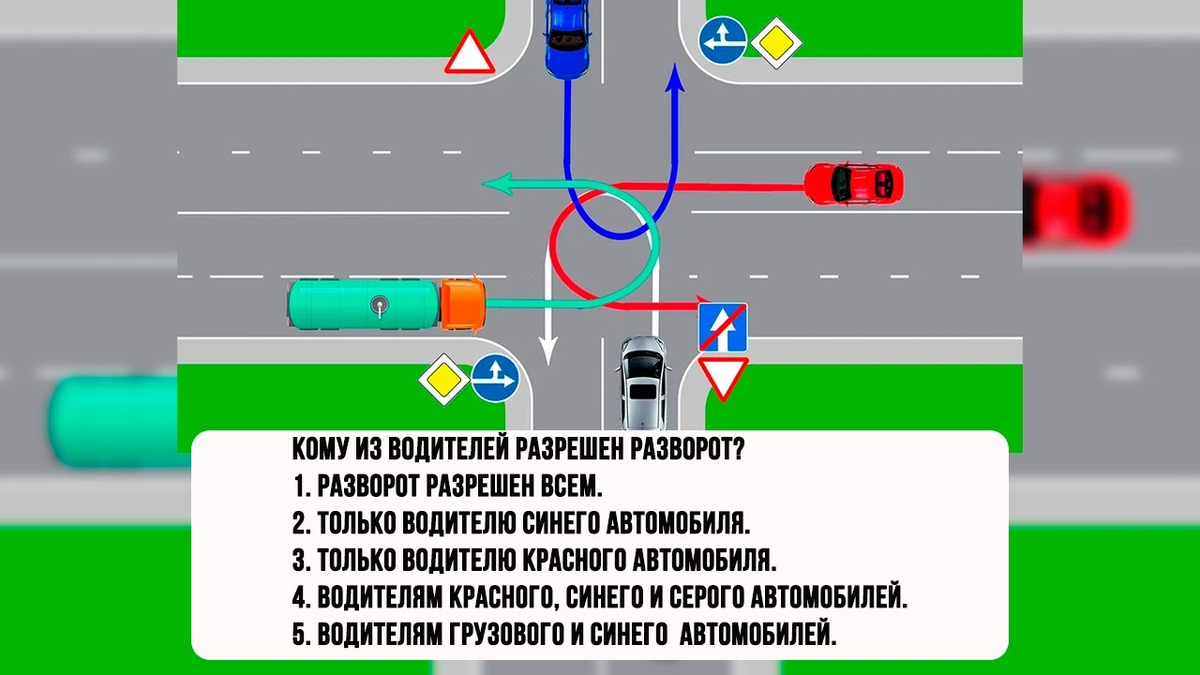 Давайте разберемся с данной задачей. Водителю серого автомобиля разворот запрещен, так как он находится на дороге с односторонним движением, и не занял крайнее левое положение. Красному разворот запрещен , по причине того , что предписывающий знак разрешает движение прямо и направо. Водителю грузового автомобиля разворот запрещен , так как при развороте на перекрестке он должен занять крайнее левое положение. Поэтому разворот разрешен только синему автомобилю. Ответ 2