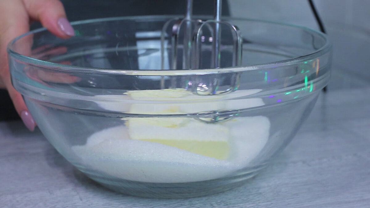 Готовим тесто. 100 г размягченного сливочного масла и 150 г сахара взбиваем миксером в течение 2-3 минут до объединения ингредиентов.