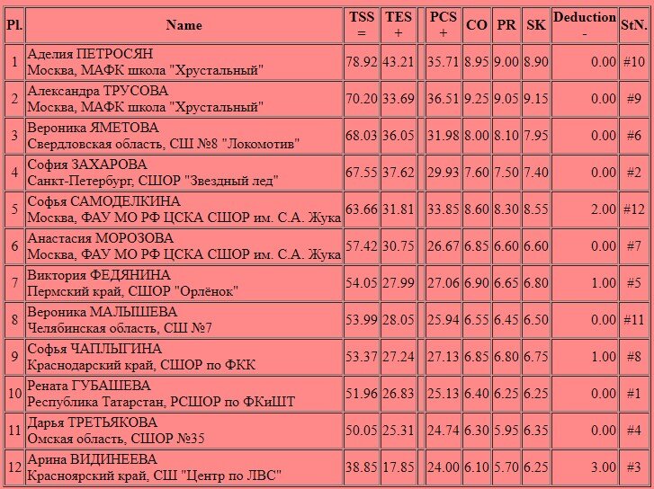 Посмотреть результаты, протоколы, фотографии, а также насладиться лучшими элементами короткой программы можно в этой статье. Результаты короткой программы: Итоговые протоколы Фотографии Лучшие элементы короткой программы девушек (по мнению судей): Лучший каскад Победу в номинации "Лучший каскад" одерживает София ЗАХАРОВА и ее каскад "тройной лутц - тройной тулуп". Лучший аксель В номинации "Лучший аксель" победа достается Аделии ПЕТРОСЯН и ее тройному акселю. Лучшее вращение Победа в номинации "Лучшее вращение" присуждается Аделии ПЕТРОСЯН. Лучшая дорожка шагов Аделии ПЕТРОСЯН и ее дорожка шагов третьего уровня - победитель в номинации "Лучшая д