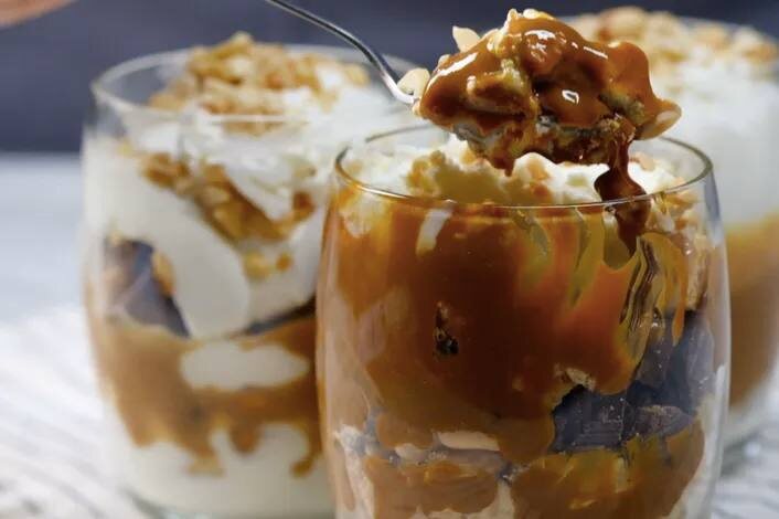 4. Выложить ингредиенты в следующем порядке: рикотта, печенье, карамель, арахис, шоколад, печенье, карамель, рикотта, арахис.