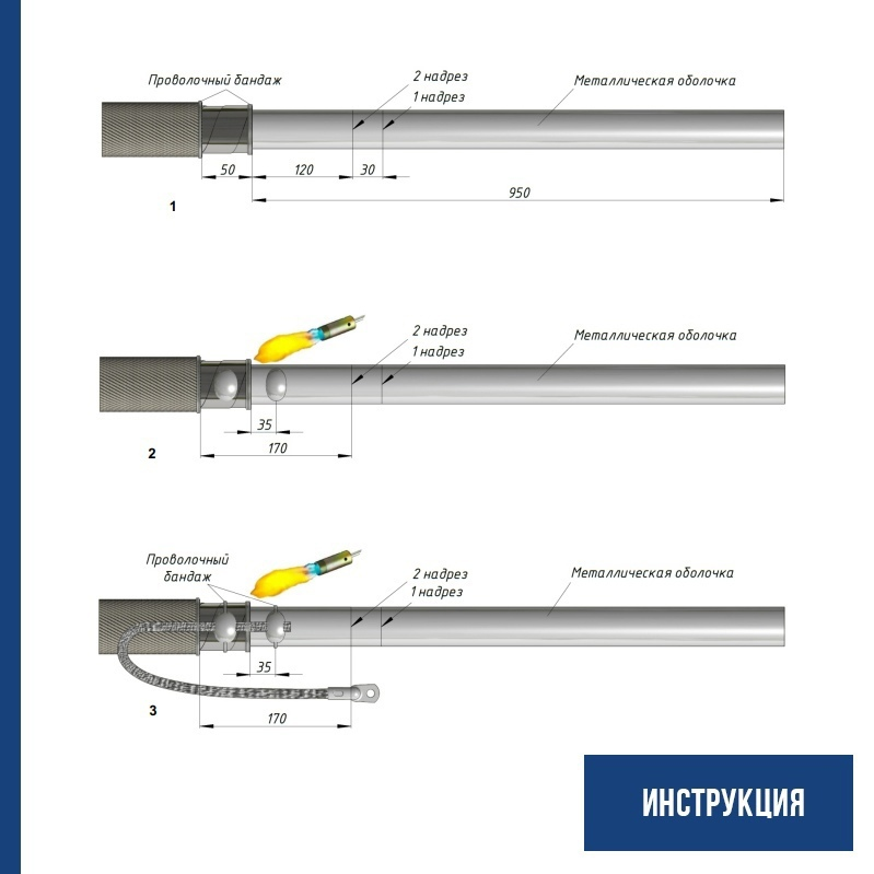 Монтаж муфты для соединения кабеля с бумажной маслопропитанной изоляцией с СИП. Шаг 1. Распрямить кабель на длине не менее 1100 мм. Наложить бандаж из двух витков проволоки на наружный покров на расстоянии 1000 мм от конца кабеля. Удалить наружный покров до бандажа. Наложить бандаж из трёх витков проволоки на бронеленты на расстоянии 5 0мм от среза наружного покрова. Произвести надрез бронелент по краю бандажа и удалить их. Сделать два кольцевых надреза на металлической оболочке, как показано на рисунке. Шаг 2. Зачистить до металлического блеска и обезжирить участки бронелент 50 мм и оболочки 120 мм. Для паяного метода крепления провода заземления к металлической оболочке кабеля использовать метод заземления «пайка», а для непаянного использовать метод «НКЗ». А) При применении метода «пайка»: облудить оболочку припоем ”А”, затем броню и оболочку припоем ”ПОС-30” в местах пайки провода заземления. Б) При применении метода «НКЗ»: облудить броню припоем ”ПОС-30” в местах пайки провода заз