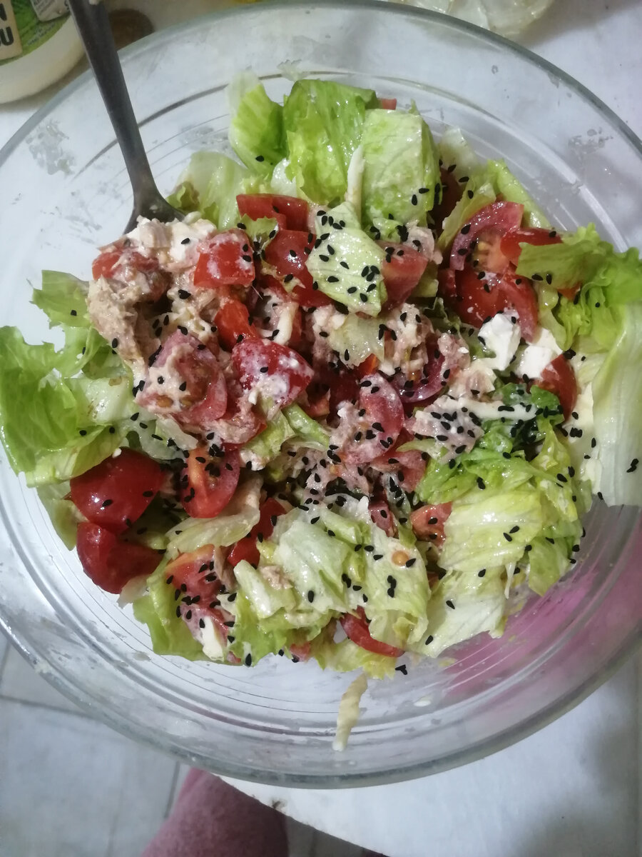 Салат подходит для тех, кто придерживается низкоуглеводного и высокожирового питания Ингридиенты: Помидоры черри-200грамм Чеснок-2 зубчика Листовой салат-100грамм Сыр пармезан-50 грамм Тунец консервированный-100 грамм Горчица-1ч ложка Лимонный сок-20 мл Майонез оливковый-2 столовые ложки Соль, перец, кунжут, орешки - по вкусу Приготовление: Для заправки: Смешиваем лимонный сок, горчицу, майонез, измельчённый чеснок и приправы по вкусу Помидоры режем половинками, измельчаем салат, добавляем тунец с жидкостью, перемешиваем все с заправкой, сверху присыпаем пармезаном, кунжутом, орехами
