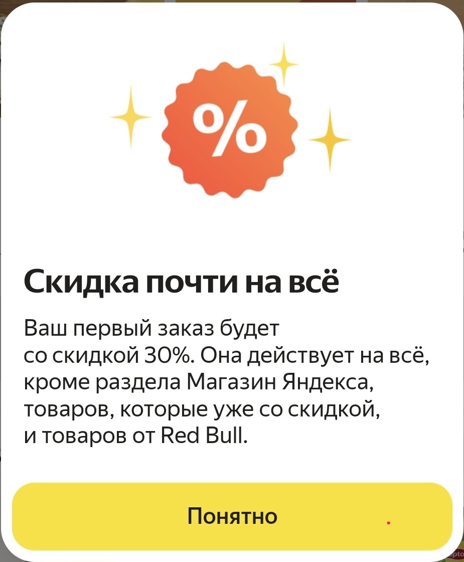 Ваш первый заказ будет со скидкой 30%. Она действует на всё, кроме раздела Магазин Яндекса, товаров, которые уже со скидкой, и товаров от Red Bull.
