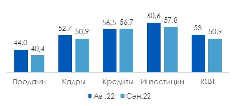 Согласно Индексу RSBI, который в сентябре 2022 года составил 50,9 пункта, деловая активность малого и среднего бизнеса снизилась, но сохранила позиции в зоне роста. Наибольшее влияние на Индекс RSBI оказала компонента кредитов, которая продемонстрировала некоторое увеличение, и компонента инвестиций, которая хоть и снизились, но сохранила максимальные значения в зоне роста. Компонента продаж упала более чем на четыре пункта и приблизилась к показателям начала лета, компонента кадров также оказалась ниже значений предыдущего месяца. «Сентябрьское значение Индекса указывает на замедление роста деловой активности в сегменте МСБ под влиянием текущих экономических и геополитических условий. На снижение Индекса в большей степени повлияли фактические результаты по выручке и консервативные ожидания по ней на ближайшие несколько месяцев - эта компонента всегда особенно чувствительна к экономической неопределенности. Тем не менее, предприниматели продолжили наращивать инвестиции в развитие бизне