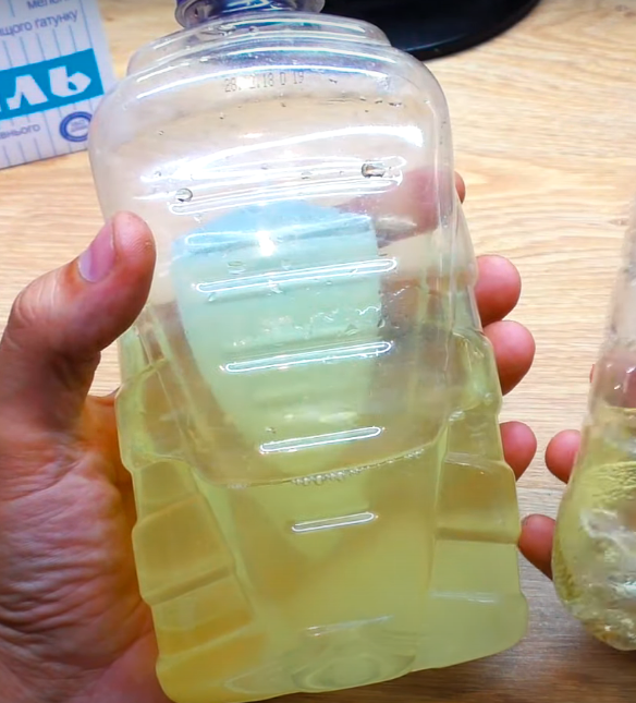 Отмеряем 100 гр соли на весах и засыпаем это в бутылку через воронку. На это количество соли требуется пол литра электролита. Заливаем электролит в бутылку. Плотно закрываем бутылку и перемешиваем, чтоб соль растворилась и оставляем это на сутки, а лучше на две.